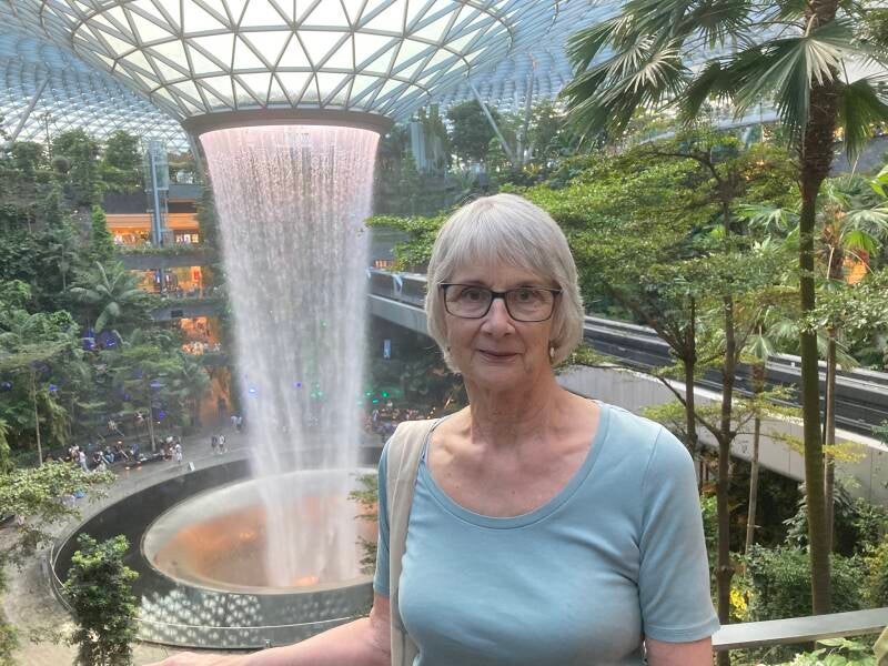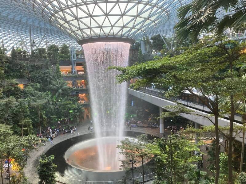 Changi Airport in Singapore is something quite extroardinary, with a surprise around every corner. First of all it is enormous and secondly it is absolutely 'out of this world' including an indoor Foerst with nature trails and an indoor 60 metres high multi-coloured waterfall and a 17 metres wide screen constantly projecting another massive waterfall. There are also lots of garbage bin sized robotic machines wandering around the terminals sweeping the floor and amazingly avoiding bumping into passengers.